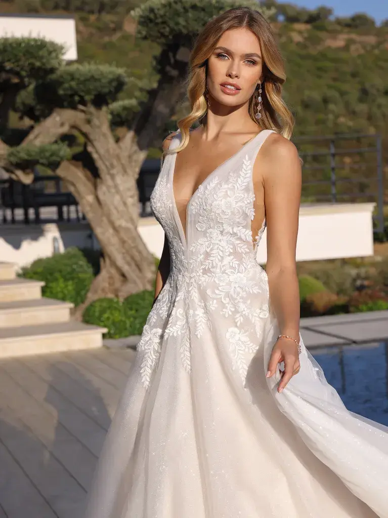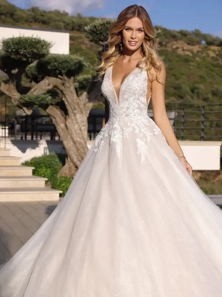 Robe de mariée de princesse confectionnée en tulle et dentelle. Le corsage scintillant présente un décolleté profond et un dos en V bas avec des emmanchures plongeantes. La jupe ample brille sous tous les angles pour une touche féerique digne d’un conte de fées !