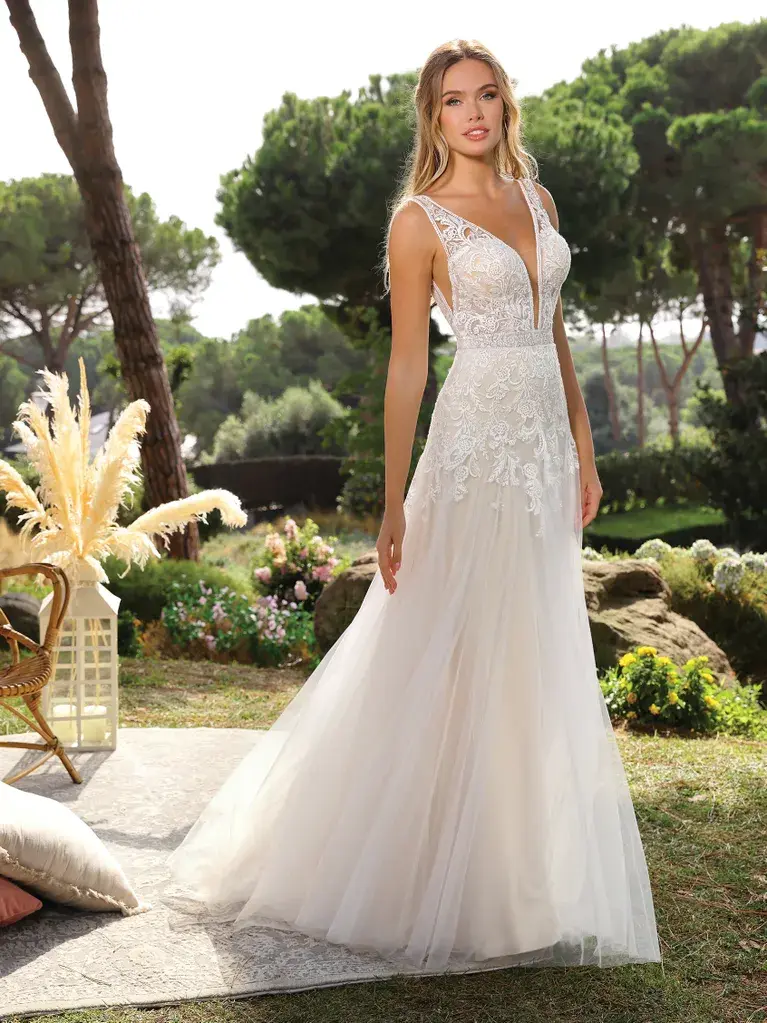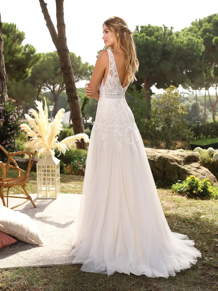 Une robe de mariée à couper le souffle, soigneusement confectionnée en tulle et en dentelle. Le corsage sensuel présente un décolleté en V, un dos et des panneaux latéraux effet illusion, avec une dentelle délicatement taillée qui s’écoule doucement dans la jupe élégante.