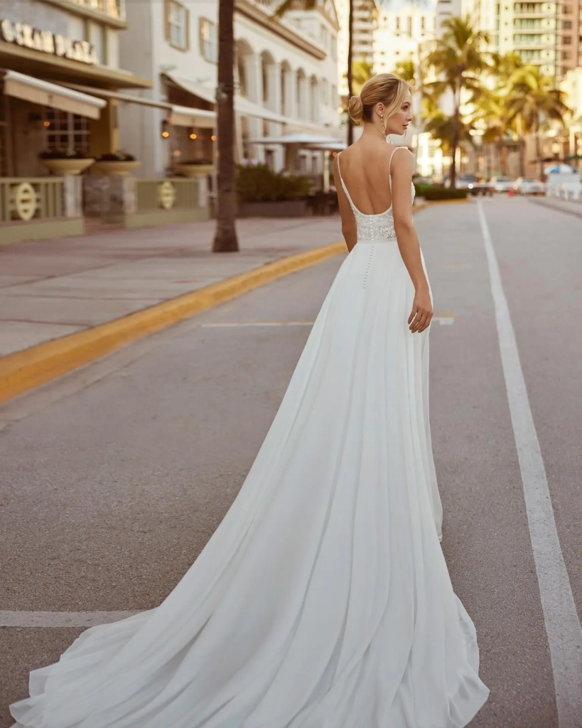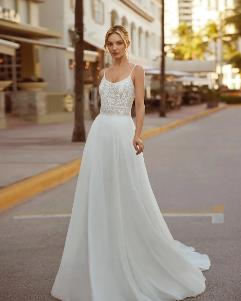 Robe de mariée de style princesse en ligne A, confectionnée en mousseline de soie. Cette robe ******* est garantie pour vous captiver, avec son encolure ronde et son dos ouvert avec des bretelles.