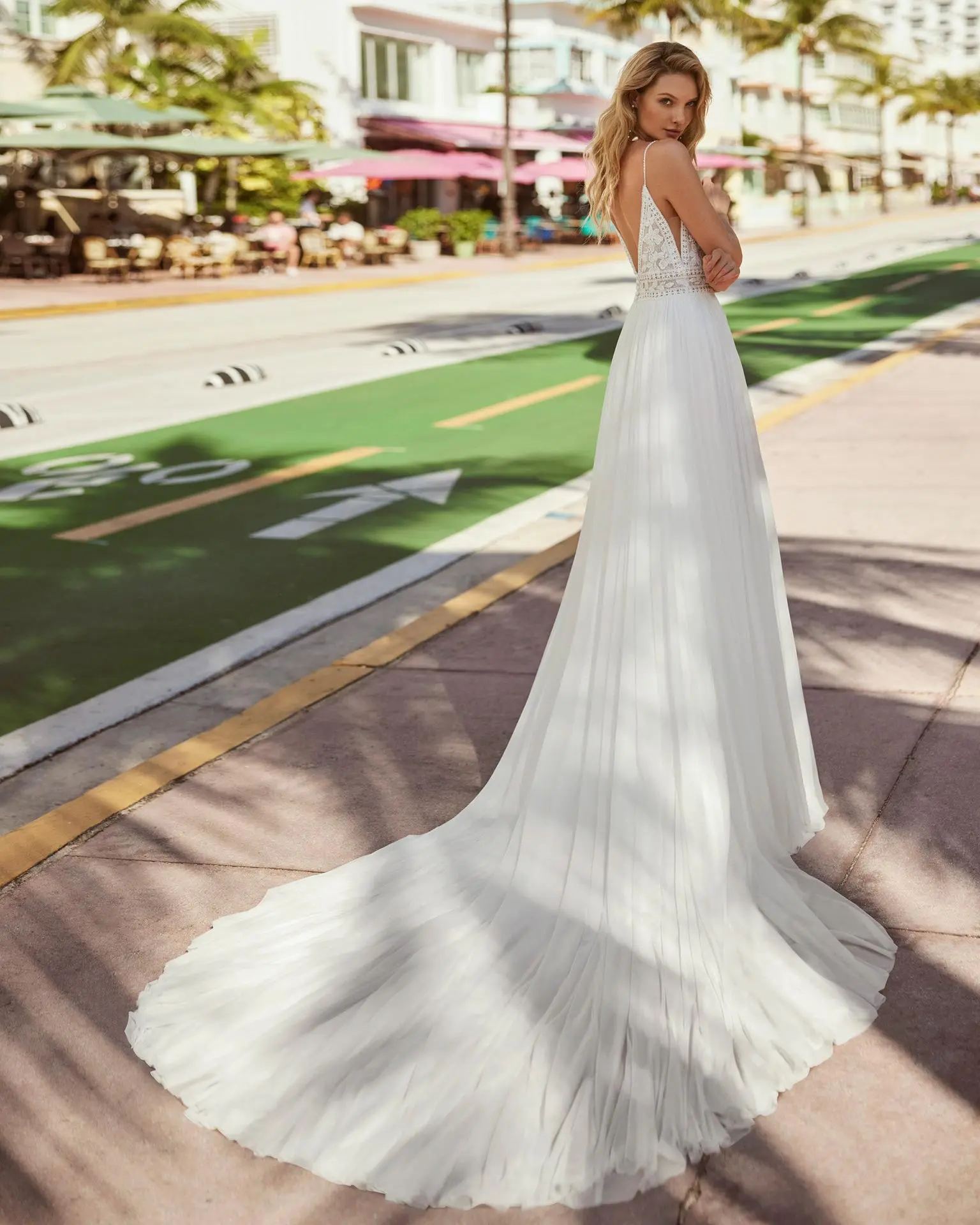 Robe de mariée simple en ligne A, confectionnée en mousseline. Dotée d’un décolleté en V, d’un dos ouvert, de bretelles et d’un corsage en dentelle et perles. Une conception délicate signée *****.