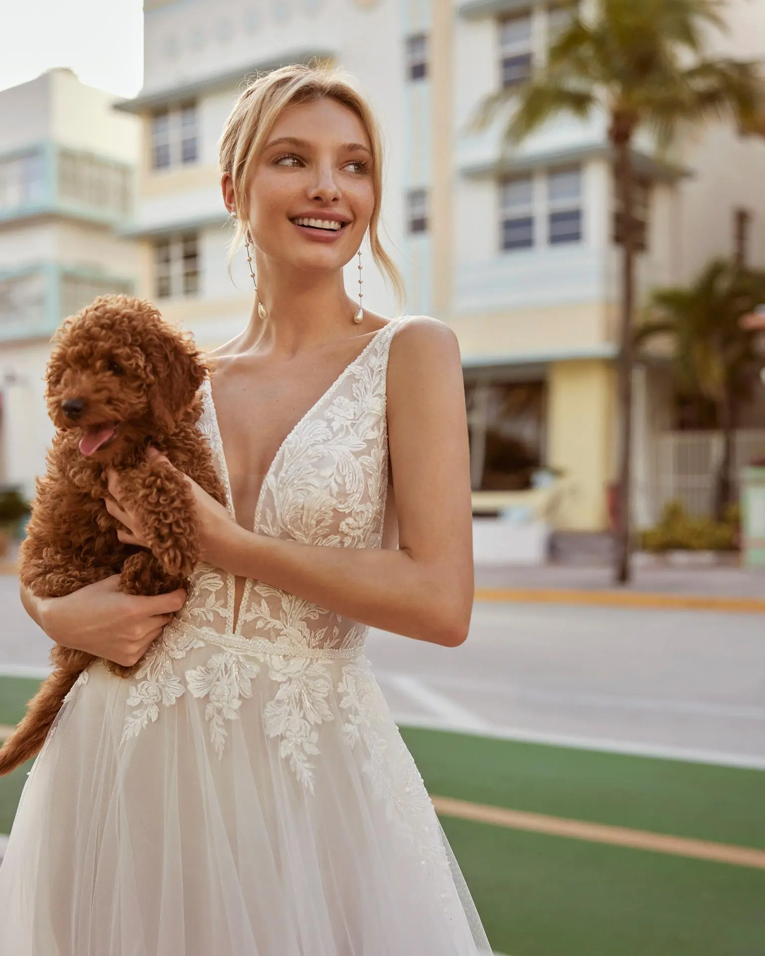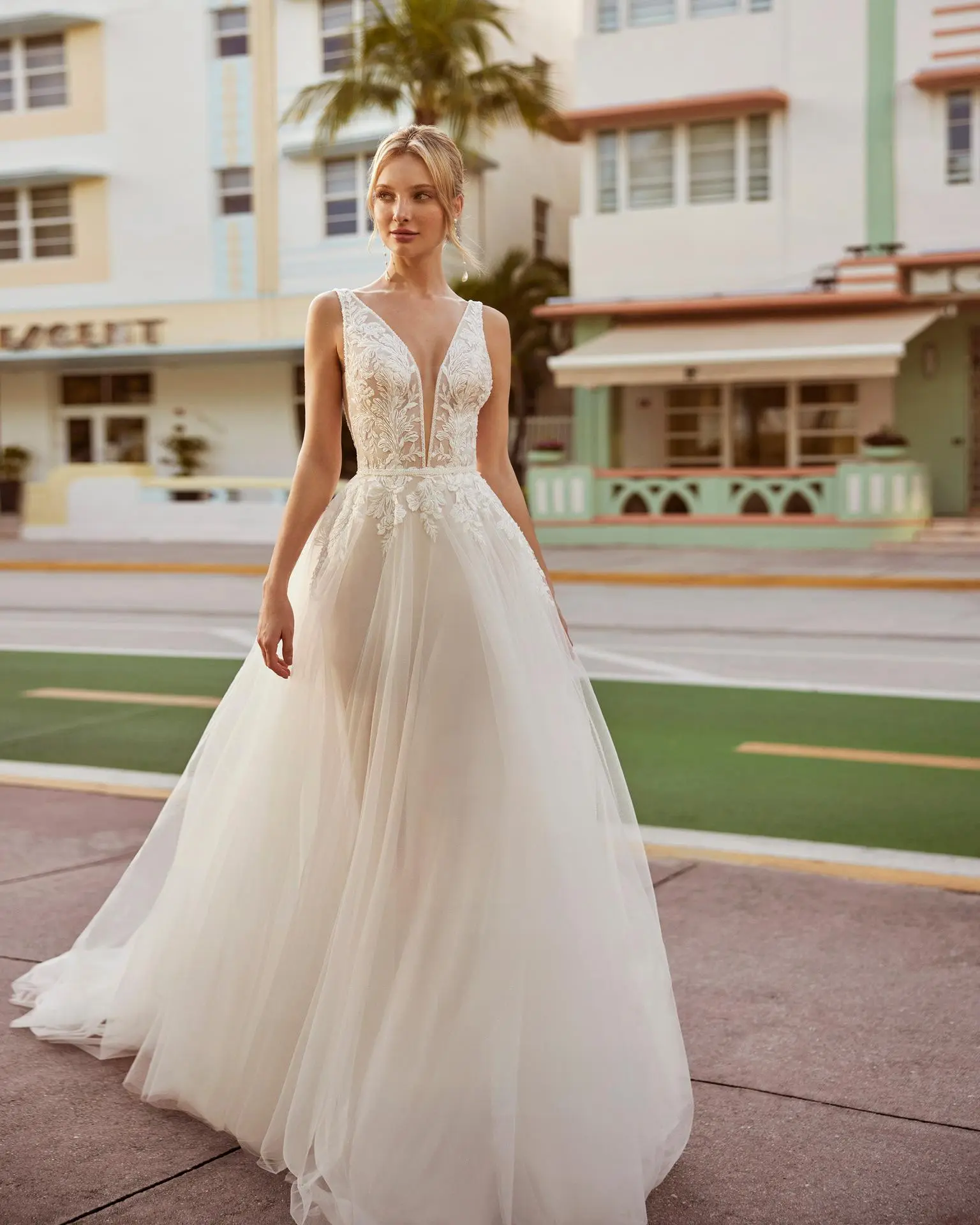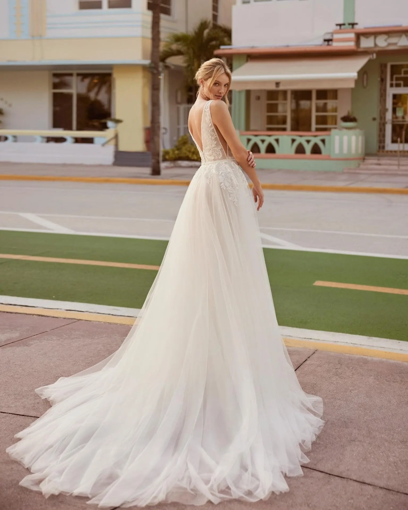 Robe de mariée romantique de style princesse, confectionnée en tulle. Avec son décolleté en V, son dos ouvert, ses bretelles et son corsage en dentelle et orné de perles, cette création tendance de******** est à ne pas manquer.