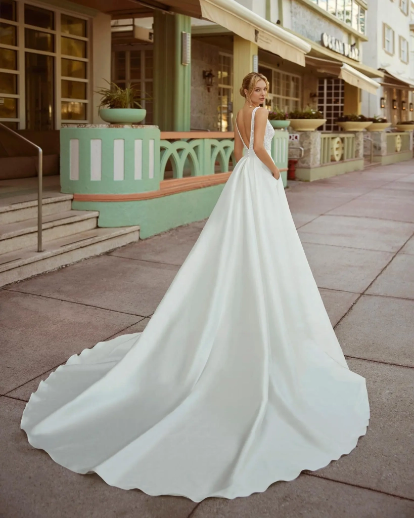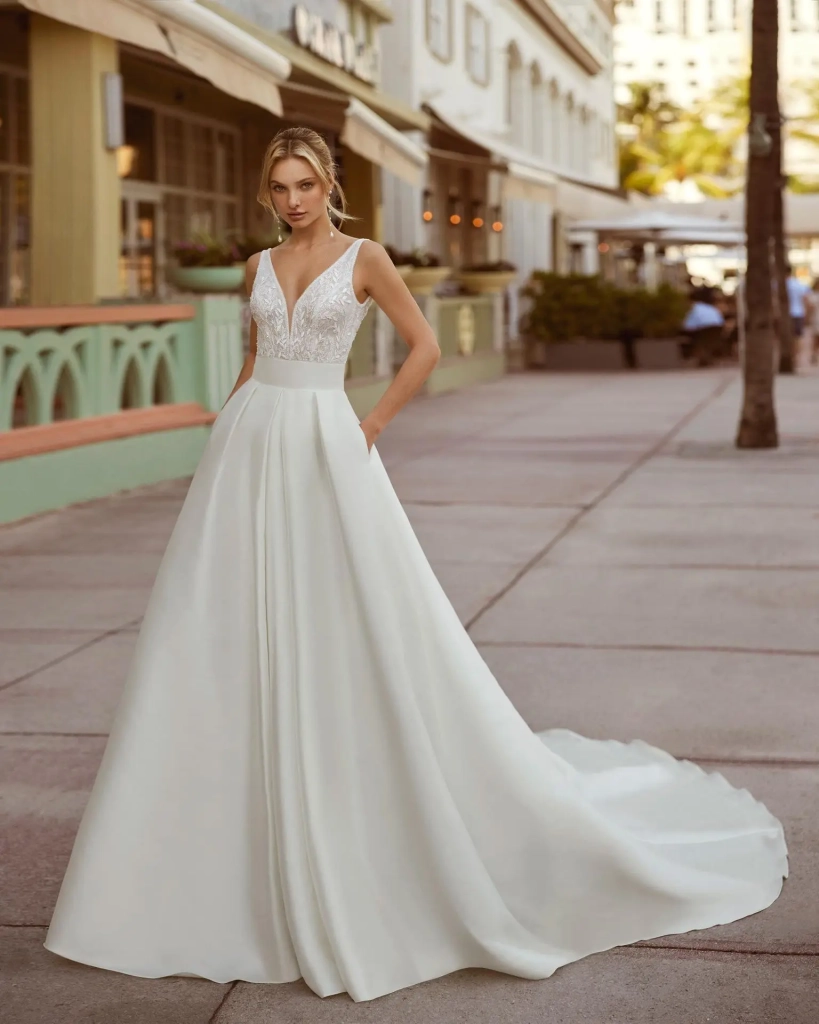 Robe de mariée de style classique princesse, confectionnée en——–. Ce design élégant et délicat de ******* présente un décolleté en V, un dos ouvert, des bretelles, ainsi qu’un corsage en dentelle orné de perles.