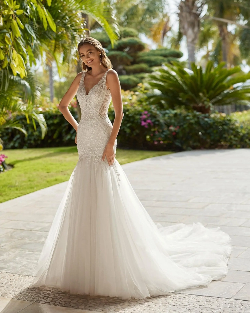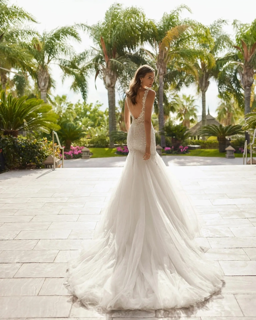 Robe de mariée de style sirène classique, confectionnée en dentelle ornée d’appliqués de perles et dotée d’une jupe en tulle de style fourreau ; avec un décolleté en V et un dos ouvert agrémenté de boutons et d’inserts transparents. Création exclusive d’******.