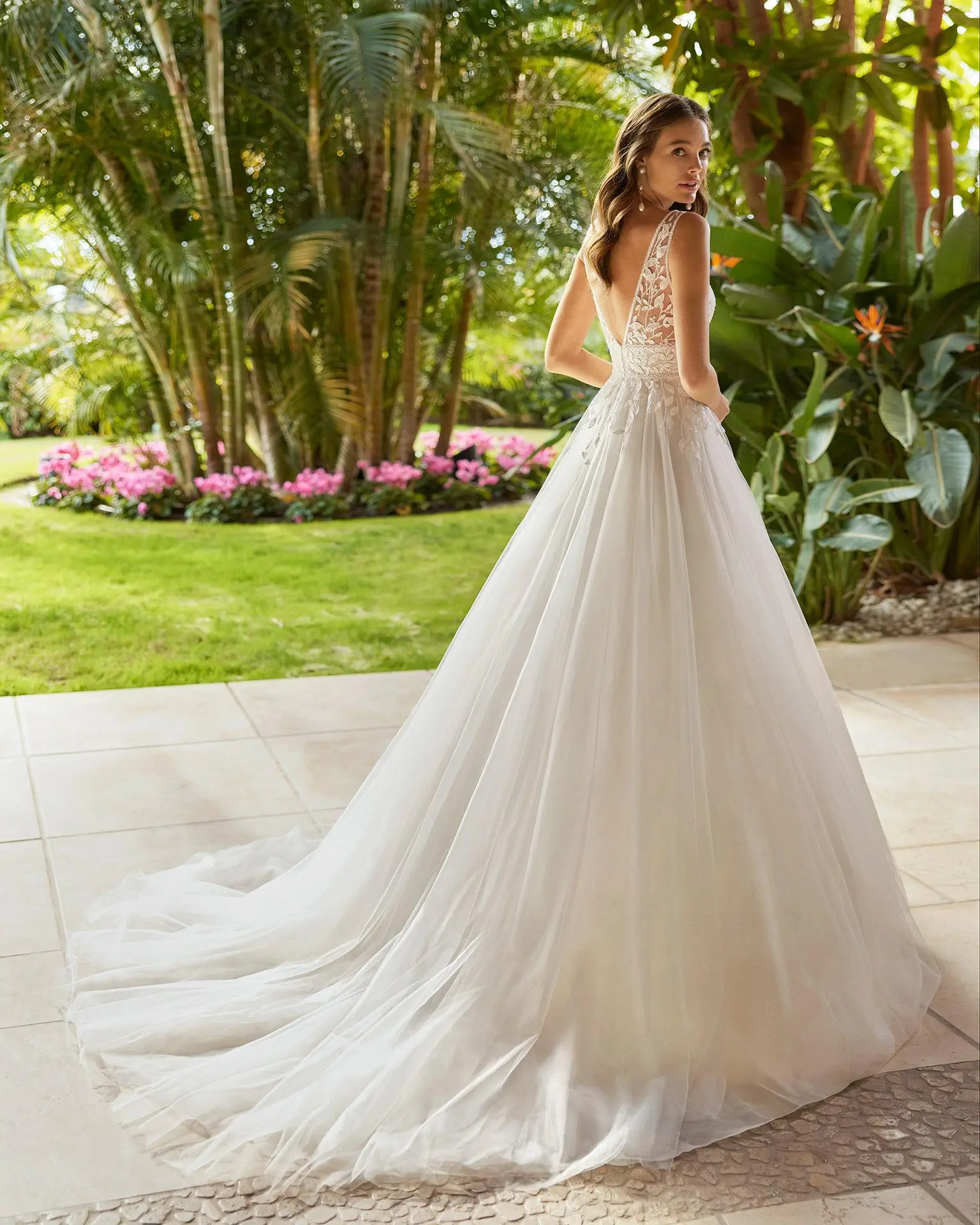 Robe de mariée de style classique princesse, confectionnée en tulle avec des appliqués de dentelle ; avec un décolleté en V et un dos en V agrémenté d’inserts transparents. Une création unique signée ******.