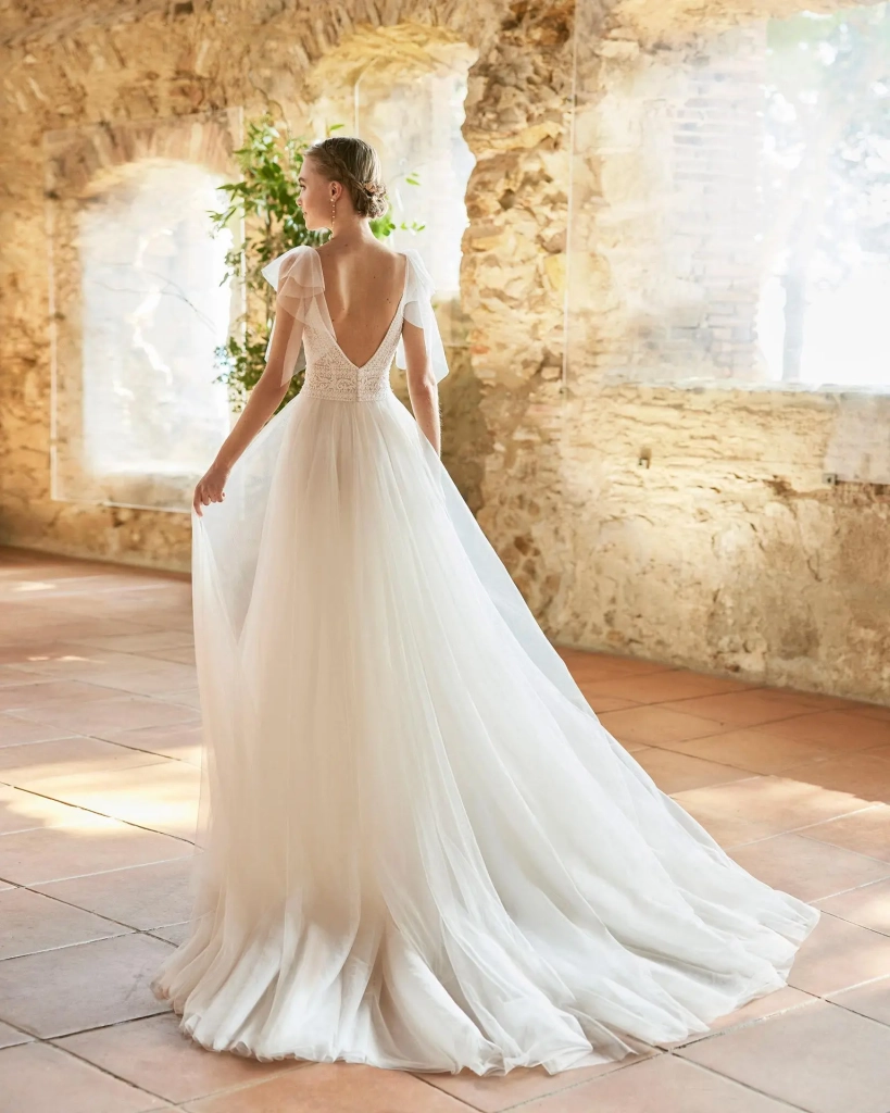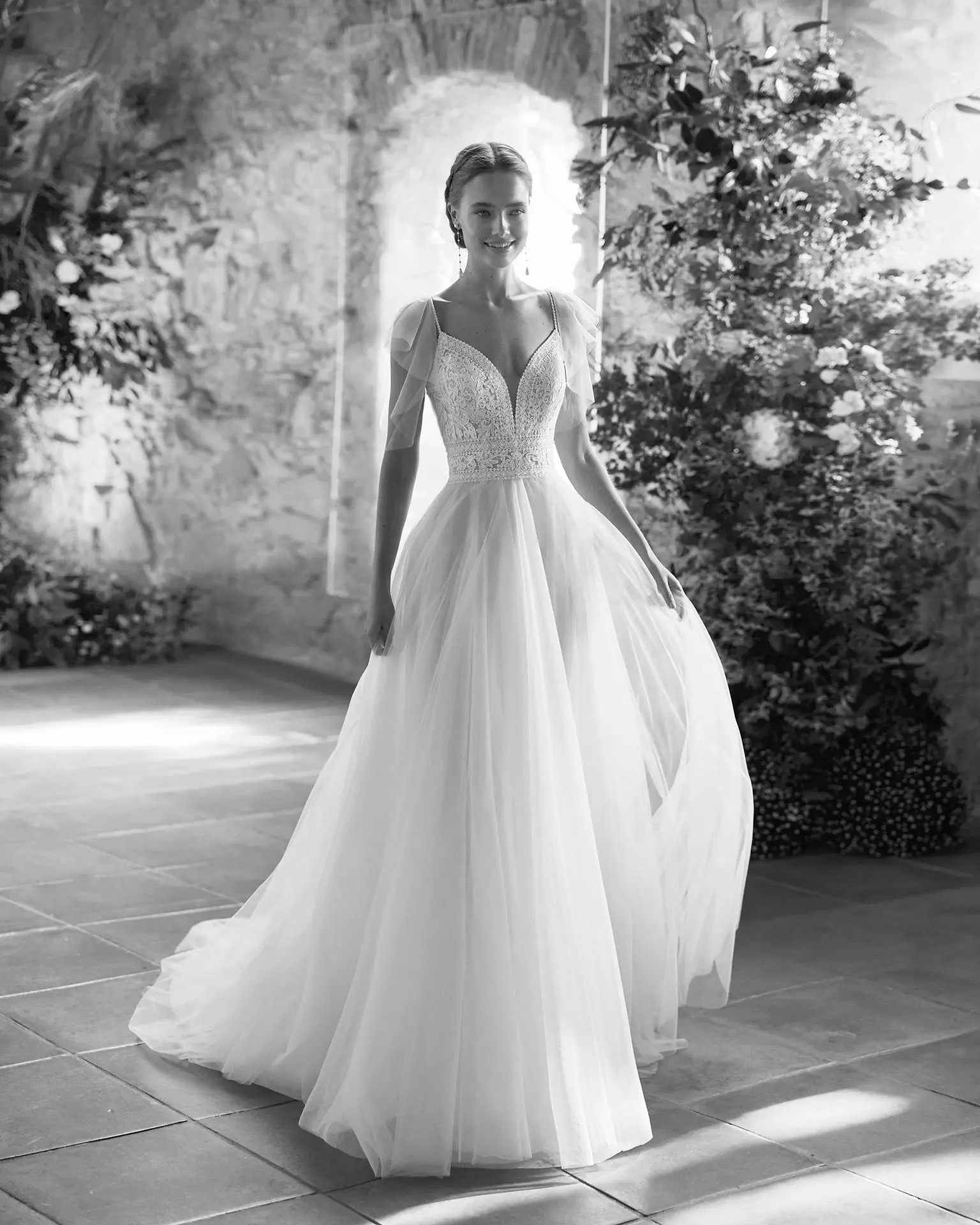 Robe de style romantique de princesse, confectionnée en tulle avec une jupe ample de style fourreau ; dotée d’un décolleté plongeant, d’un dos en V et de bretelles ornées de nœuds et de broderies de perles. Cette création rêveuse signée Alma Novia est réalisée en tulle combiné avec de la dentelle brodée et des perles.