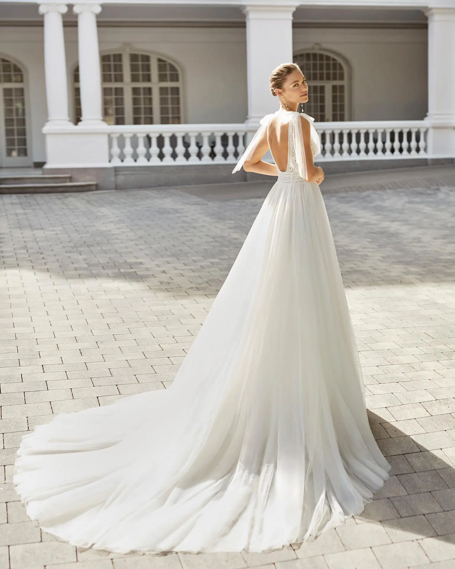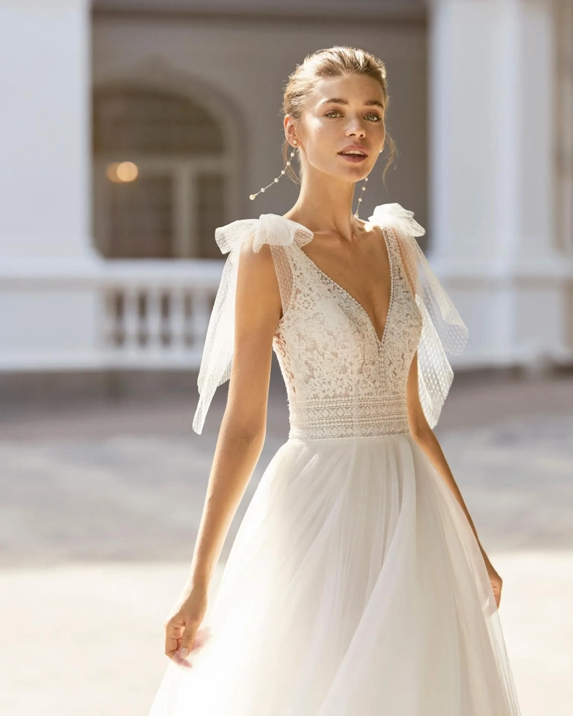 Robe de mariée de princesse en tulle et dentelle perlée. Décolleté en V et dos bas. Agrémentée de nœuds en tulle sur les épaules.