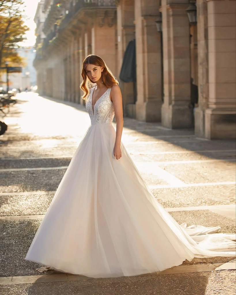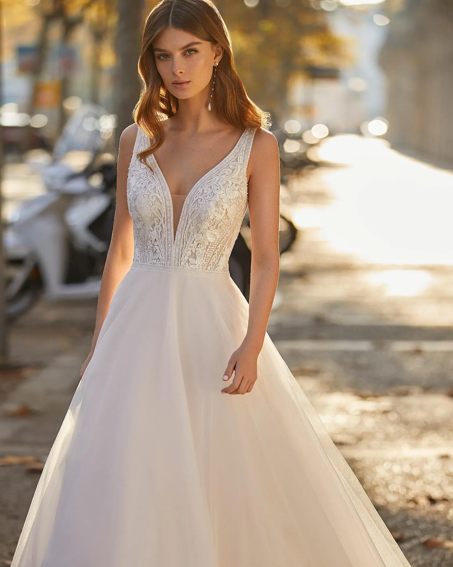 Robe de mariée romantique de style princesse, confectionnée en tulle et ornée d’applications de dentelle brodée de perles. Dotée d’un décolleté profond et d’un dos bas, cette robe unique de ****** est faite de tulle et de dentelle agrémentée de perles.
